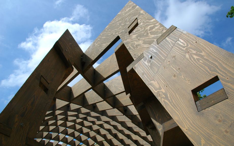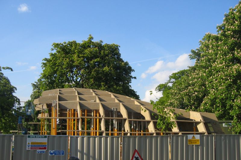 A estrutura é concebida com 427 vigas únicas de madeira, interligadas de maneira a criar os dramáticos 17m de vão, num ritmo deslocado. O tecto que não é apoiado em pilares ou paredes, é formado por uma grelha offset ondulada de madeira laminada. O sistema de viga recíproca cria uma estrutura contínua que corre desde a cobertura até formar as paredes do pavilhão.